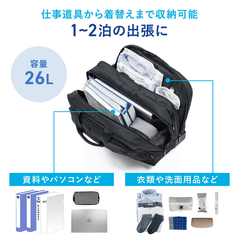 容量は、26リットルで1泊から2泊の出張にも最適だ。