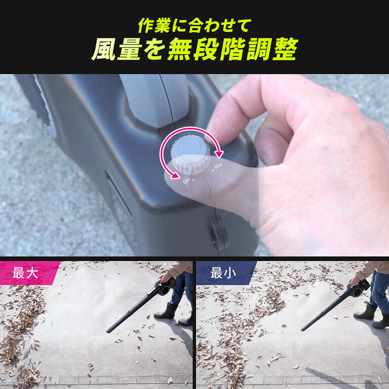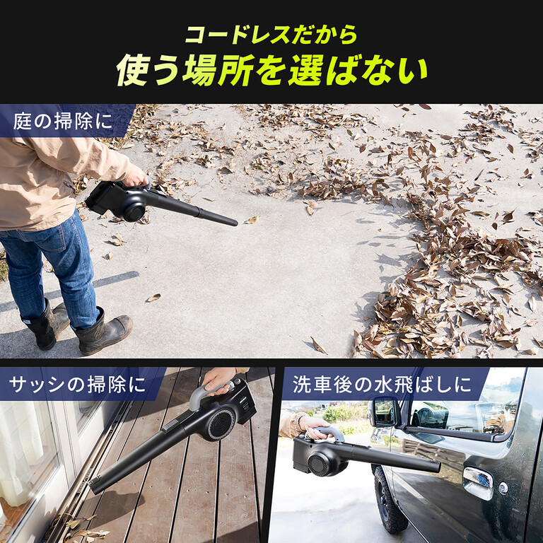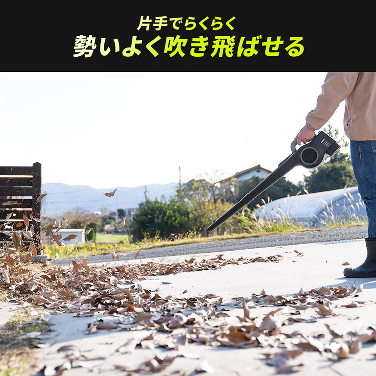 本製品は、ガス不使用の繰り返し使える充電式ブロワー。風の勢いで落ち葉飛ばし、水飛ばしの際に便利に使用できる。