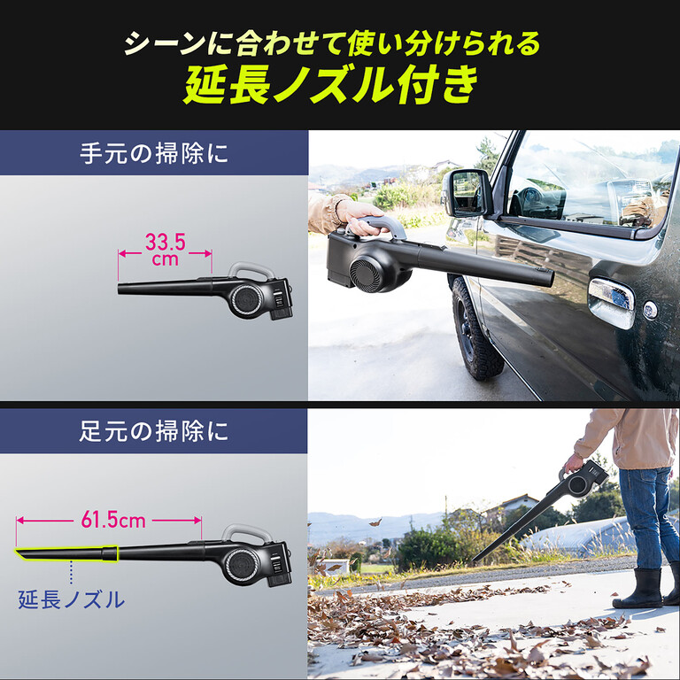 ■シーンに合わせて使い分けできる延長ノズル付きのコードレスで使用できる充電式ブロワー「200-CD084」