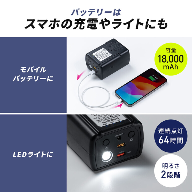 充電バッテリーは単体で、スマホへの充電用モバイルバッテリーとしてや、2段階の明るさ調整ができるLEDライトとしても使うことができる。