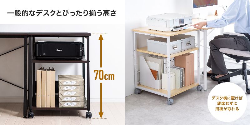 本製品は、レーザープリンタやインクジェットプリンタ、消耗品を同時に収納することができる、プリンタラック。天板サイズは幅52cm、奥行52cmあり、小型A3プリンターに最適だ。一般的なデスクと同じ高さ70cmで、デスク横にキレイに並べられ作業スペースの拡張もできる。