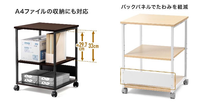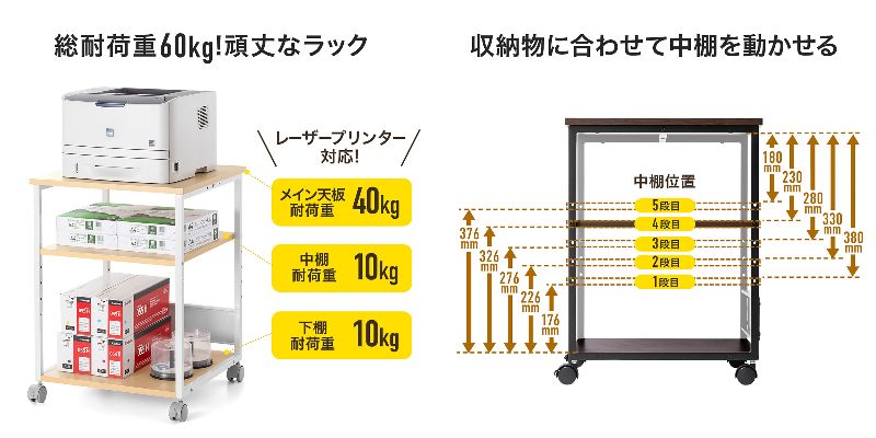 フレームは丈夫なスチール製で、天板は耐摩耗性、耐水性に優れたメラミン化粧板仕様。耐荷重は天板が40kg、中棚と底板が各10kgの総耐荷重60kgで、しっかり安定して使用できる。中棚は5段階で位置調整可能で、インクや用紙など機器のサイズによって変更可能だ。