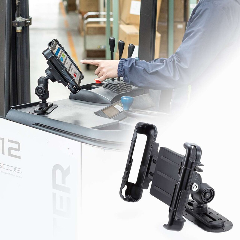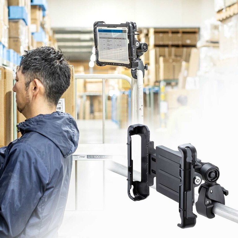 フォークリフトや台車などに産業用タブレットを固定できるホルダー。タブレットを使用する生産管理・現場業務をスムーズに進められる。