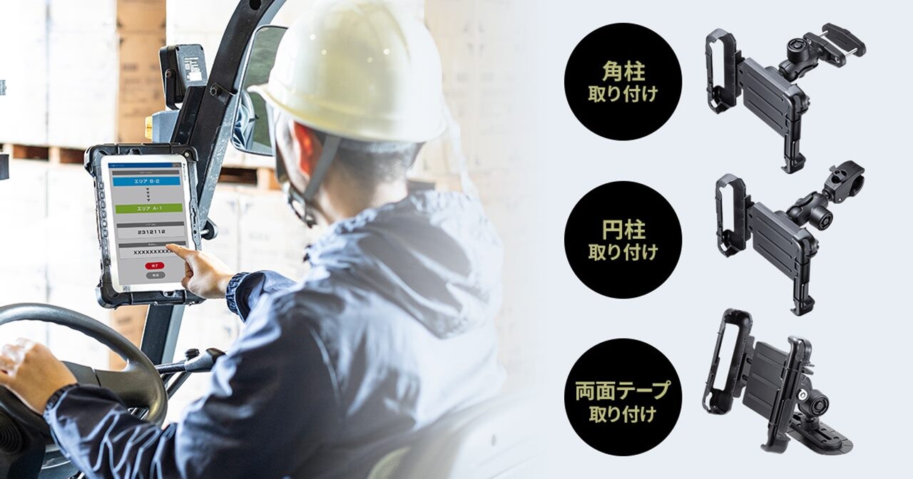 サンワサプライ株式会社は、産業用タブレットなどの厚みのあるタブレットをフォークリフトや台車に固定できるタブレットホルダー「VEH-TBHLD1(角柱取り付け)」「VEH-TBHLD2(円柱取り付け)」「VEH-TBHLD3(両面テープ取り付け)」を発売した。工場や物流倉庫での業務にも使える耐久性と、セキュリティ性も高いタブレットホルダーだ。