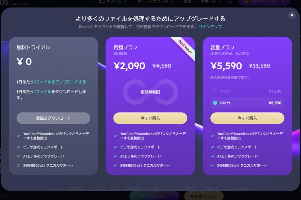 ダウンロードはサインアップすることで可能になるが、無料トライアルでは1日に1ファイルをダウンロードすることができる。アップロードは1日あたり3ファイルまで。ダウンロードできるファイル形式はMP3となっている。