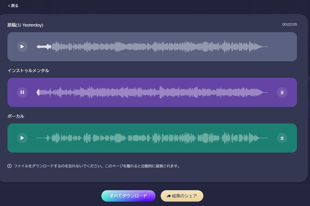 楽曲から分離した2つのファイルは、個別にダウンロードまたは両方ダウンロードすることができる。
