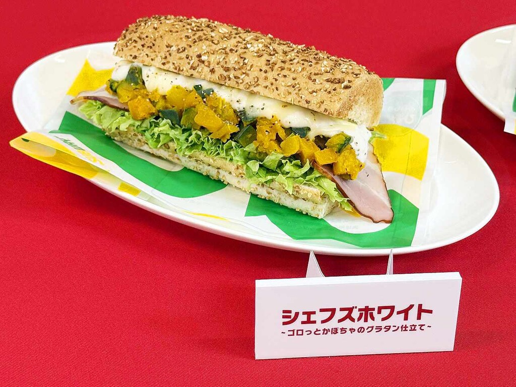 『シェフズホワイト~ゴロっとかぼちゃのグラタン仕立て』は、北海道の雄大な自然の中ではぐくまれたミルクを使ったホワイトソースを使用。ローズマリーで旨みを引き出したかぼちゃの甘味とホワイトソースの濃厚なミルクの香り、ベーコンとチーズの塩気が食欲をそそる。今回のメニューは、シェフが提供する最高のレシピで味わっていただきたく、サブウェイでは珍しいカスタマイズ不可のサンドイッチとなる。