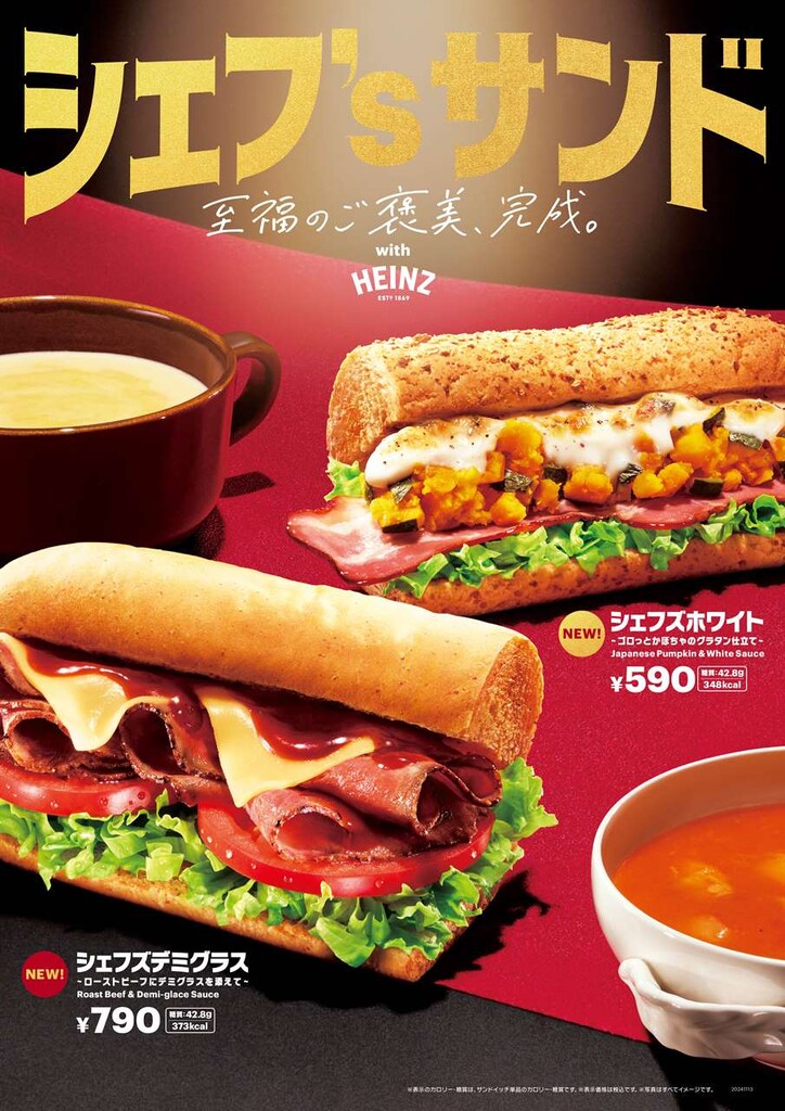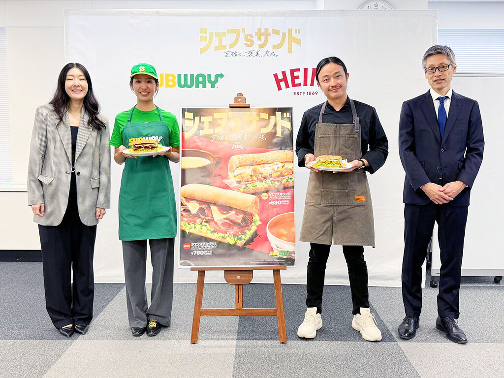 日本サブウェイ合同会社が展開するサンドイッチチェーン「サブウェイ」は、ハインツ日本株式会社とコラボした2種のサンドイッチ『シェフズデミグラス~ローストビーフにデミグラスを添えて~』と『シェフズホワイト~ゴロっとかぼちゃのグラタン仕立て』を、2024年11月13日(水)から期間限定で、全国のサブウェイにて販売を開始した。また、サイドメニューのスープ2種もハインツコラボの『濃厚カントリーコーンスープ』、『ゴロゴロ野菜のトマト&クラムスープ』にリニューアルし、同日より全国のサブウェイでレギュラー販売を開始した。発売に先立ち、プレス関係者向けに発表会が実施された。