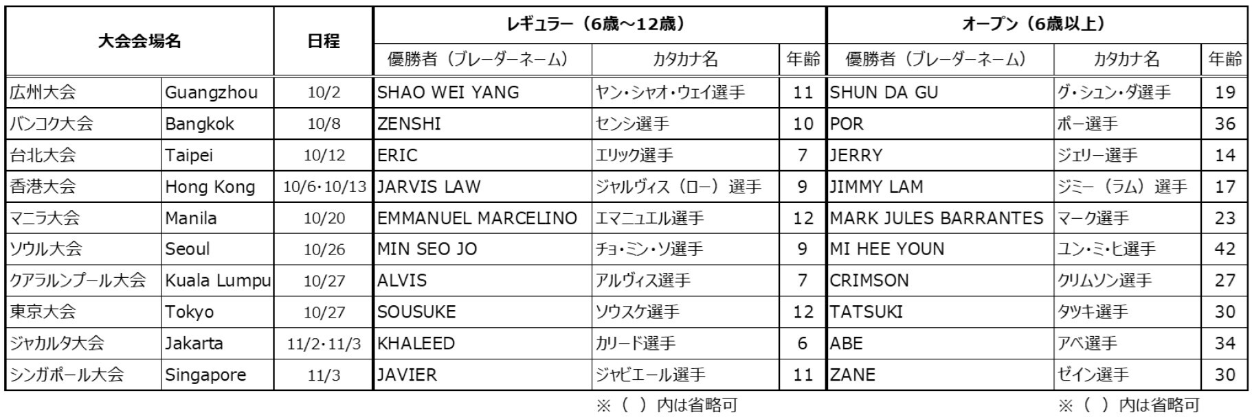 レギュラークラス大会には総勢3,299名がエントリーし、優勝者は東京大会選出のソウスケ選手(12才)だった。優勝したソウスケ選手は、初戦は苦戦するも決勝戦は相手に1ポイントも与えず、すべて「スピンフィニッシュ※1」でストレート勝利。悔しくて涙する敗者に、出場選手たちが健闘を称えて励ましあう姿も見られた。