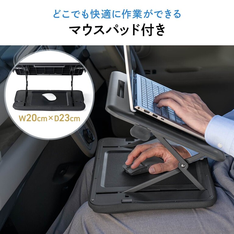狭い車内などでパソコン作業を行う場合、この膝上テーブルがあれば、マウスパッド付きのためマウスを使って快適に作業ができる。マススを使うスペースがない場所でも快適にパソコン作業が可能だ。