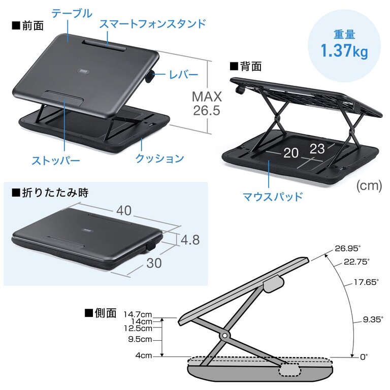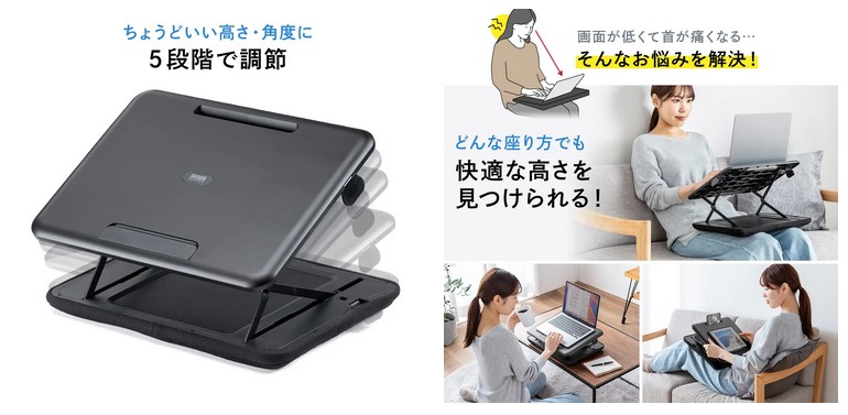 サンワサプライ株式会社が運営している直販サイト『サンワダイレクト』は、5段階で高さ調整が可能で、マウスパットや裏面にメッシュクッションが付いている膝上昇降テーブルを発売した。