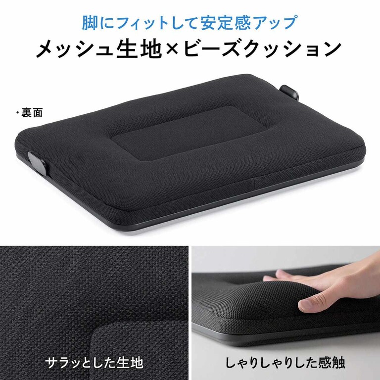 膝上テーブルの裏面は、メッシュ生地のビーズクッションがついている。触り心地がよく、膝上に置いた際に足にフィットしてずれにくいため、膝上テーブルで安心して作業ができる。