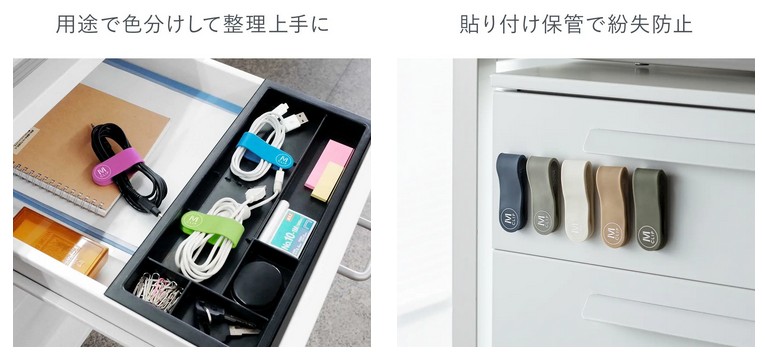 デスク周りや机の中、カバンの中でケーブルを整頓できる。マグネットで挟むことができるので、シャツにイヤホンのケーブルを留めることもできる。アイデア次第で本のしおりや、冷蔵庫の輪ゴム止めなど、使い方は無限大。