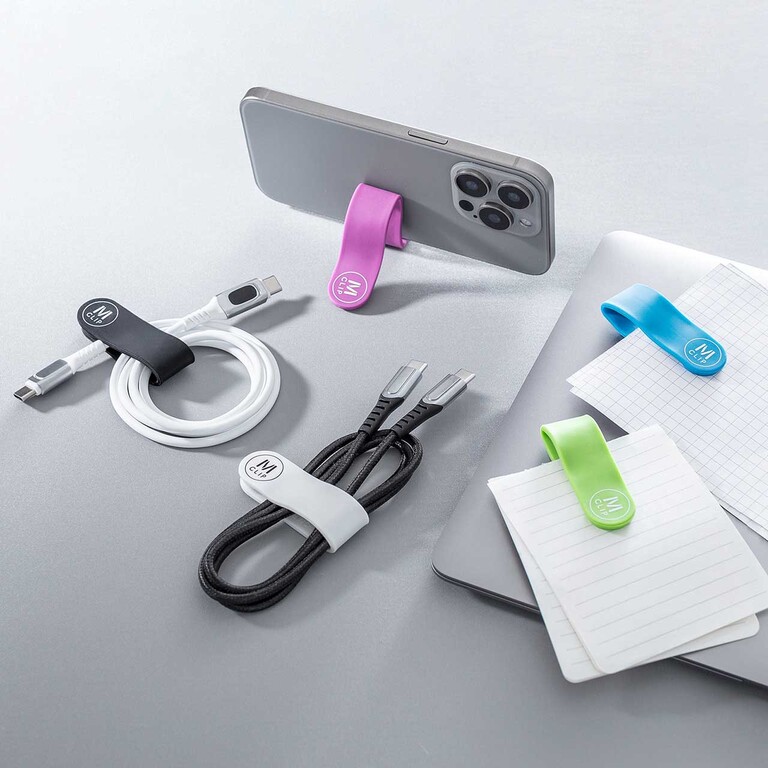 両端にマグネットを内蔵しており、ケーブルをまとめたり、メモをとめたり、はさんだりできる。好きな形に変形できるフレキシブルな素材なので、スマホなどの簡易スタンドにもできる。
