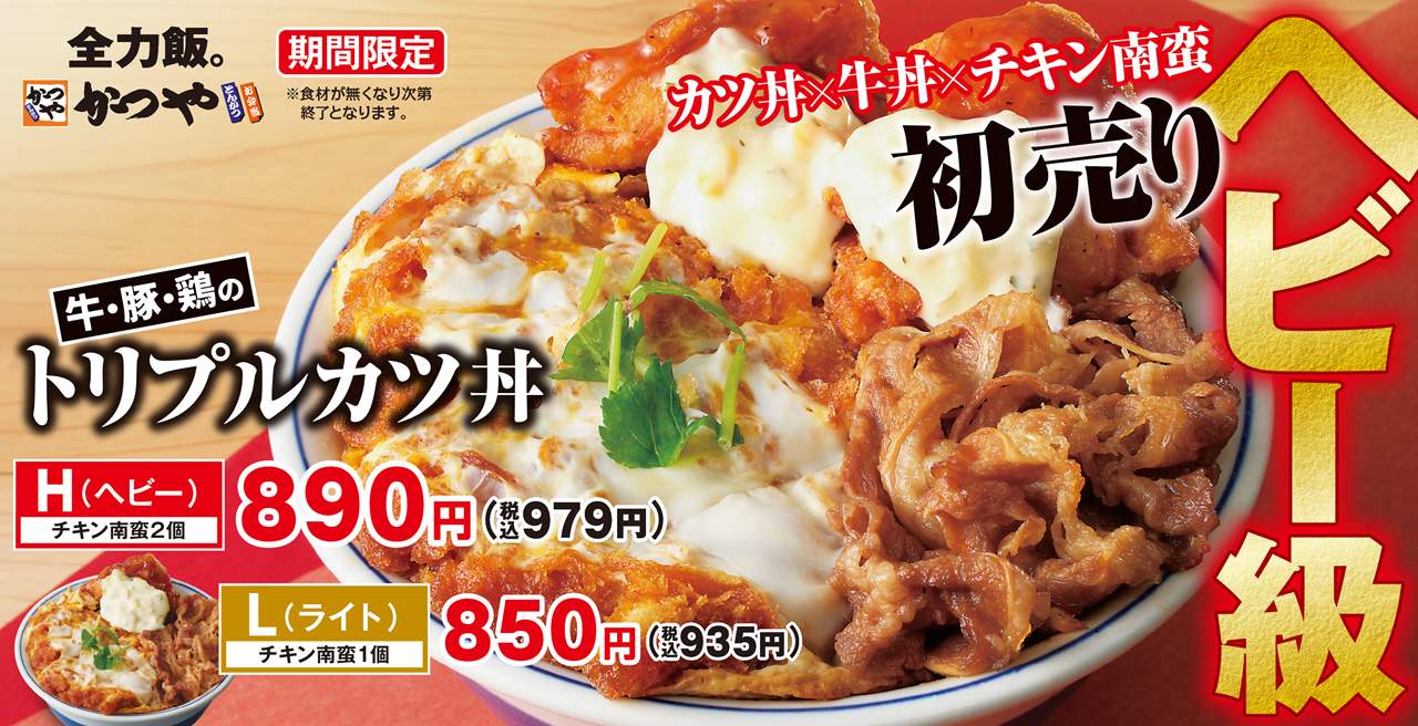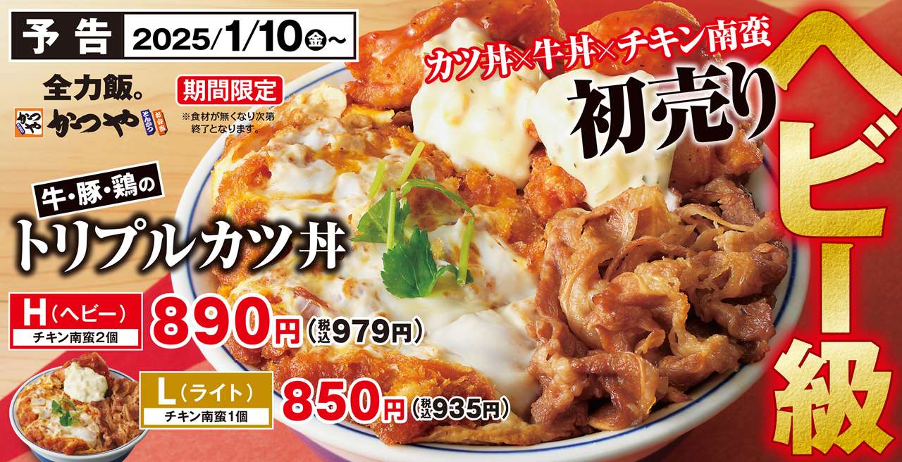 アークランドサービスホールディングス株式会社の⼦会社、とんかつ専⾨店「かつや」を展開している株式会社かつやは、国内「かつや」にて「牛・豚・鶏のトリプルカツ丼」を2025年1月10日(金)より期間限定で販売を開始する。