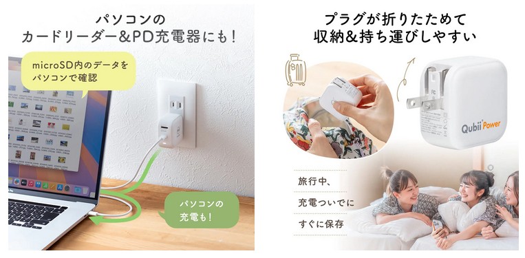急速充電しながらスマホの写真・動画を自動バックアップできるPD充電器&カードリーダー「Qubii Power」だ。スマホの容量不足をこれ1台で解決。大切なデータを寝ている間に急速充電しながら自動でバックアップできる。かんたん3ステップですぐ使えます。1.microSDカードを入れる、2.コンセントに接続、3.スマホに接続するだけでいい。