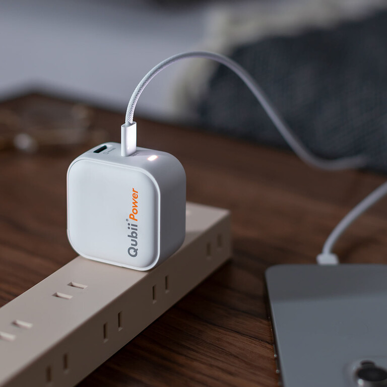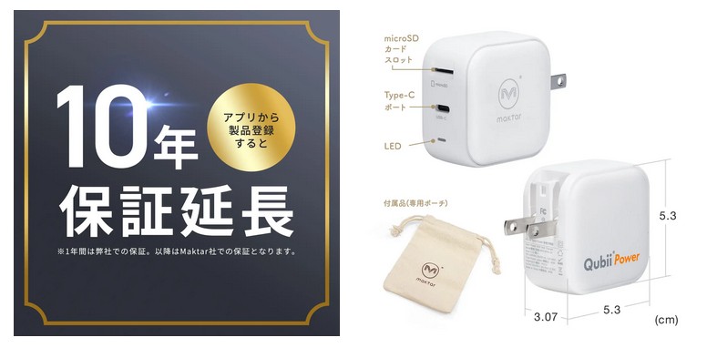 今までのQubiiシリーズは別で充電器が必要でしたが、Qubii Powerは充電器一体型。一体型なので見た目がスッキリしている。筐体は充電器一体型でコンパクトサイズのため、付属のポーチでの持ち運びにも便利だ。