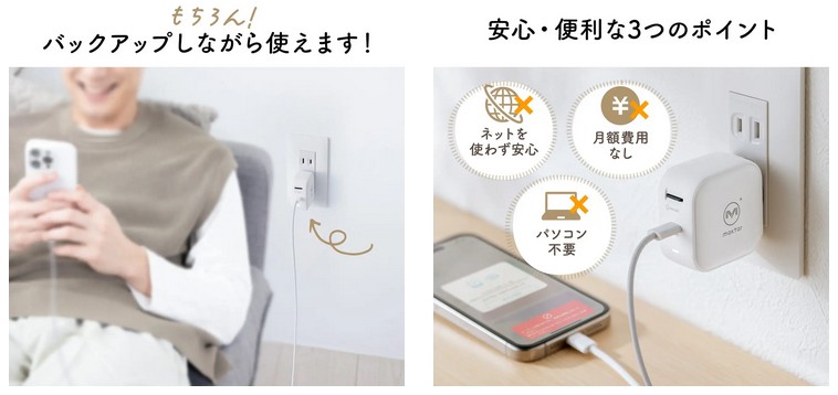 バックアップしながらでもスマホを使用することができる。ネットを使わず、月額費用がかからず、パソコン不要で安心・便利だ。
