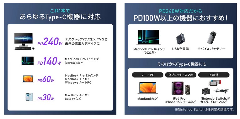 USB Power Delivery対応により、最大240Wの高速充電が可能だ。ノートPCや大型デバイスも短時間で充電できる。eMarkerチップの搭載により、安定した電源供給ができる。