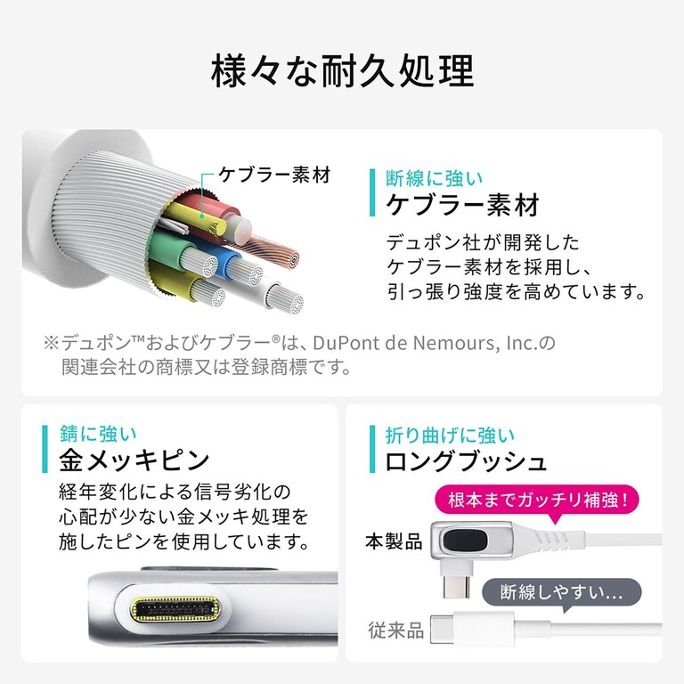 ケーブルの内部には防弾チョッキにも使用されるケブラー繊維を採用。日々の使用で生じる引っ張りや曲げなどの負荷にも耐えられる高い耐久性を備えている。
