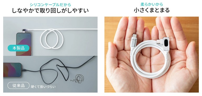 サンワサプライ株式会社が運営している直販サイト『サンワダイレクト』は、しなやかでコンパクトになり取り回しがしやすいシリコン仕様のPD電力表示機能が付いた人気のUSB Type-CケーブルのL字コネクタタイプ「500-USB078L-1(1m)」、「500-USB078L-2(2m)」を発売した。