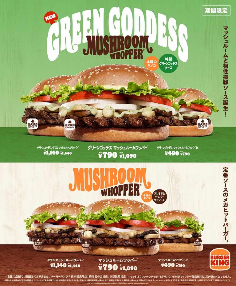 『バーガーキング の『マッシュルームワッパー 』ファンの皆様も、きのこ好きの皆様も、期間限定の人気シリーズ『マッシュルームワッパー 』の新作『グリーンゴッデス マッシュルームワッパー 』『グリーンゴッデス ダブルマッシュルームワッパー 』『グリーンゴッデス マッシュルームワッパー Jr.』の3商品を、ぜひこの機会にお楽しみください。』