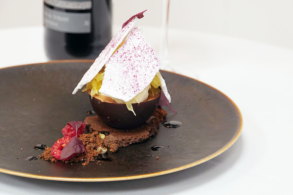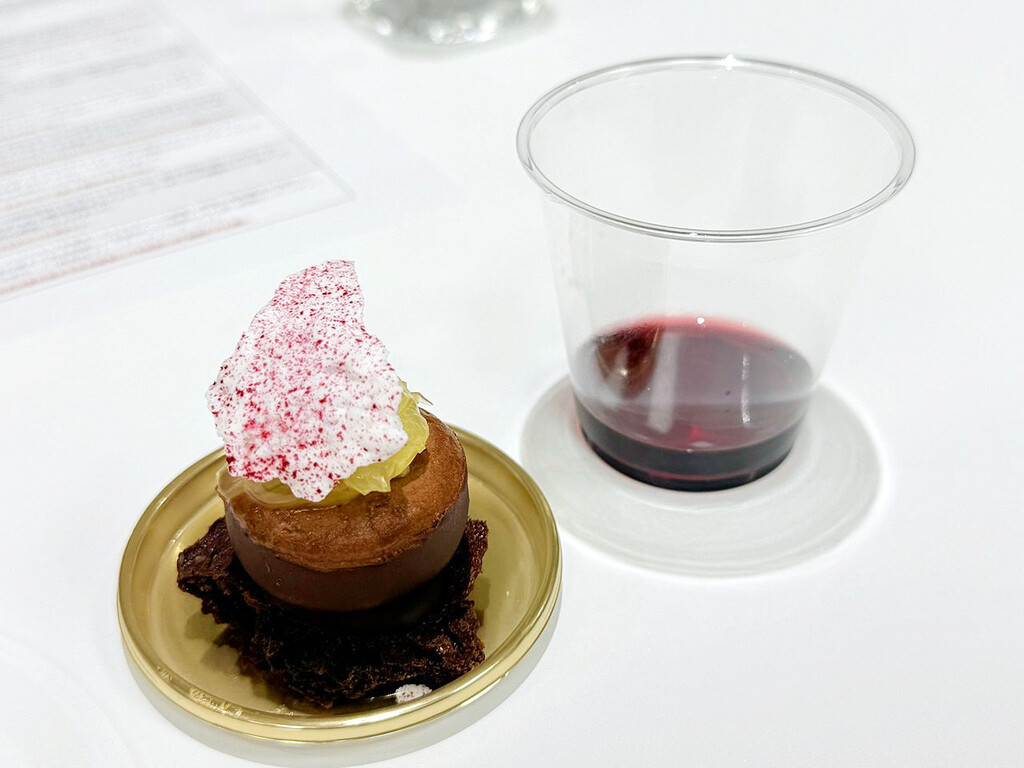 『ゴ・エ・ミヨ2023 』 でベストパティシエ賞を受賞した際に授賞式で提供されたデザート。バヌアツ共和国のマレクラ島のビーントゥーバーチョコレートを使用。パプリカやバルサミコ酢でチョコレートの味わいを表現した延命寺シェフのスペシャリテ。(※)1972 年にフランス・パリで誕生したレストランガイドおすすめのペアリング:カリヌス(ガルナッチャシラー)( 1 杯) 1,540 円