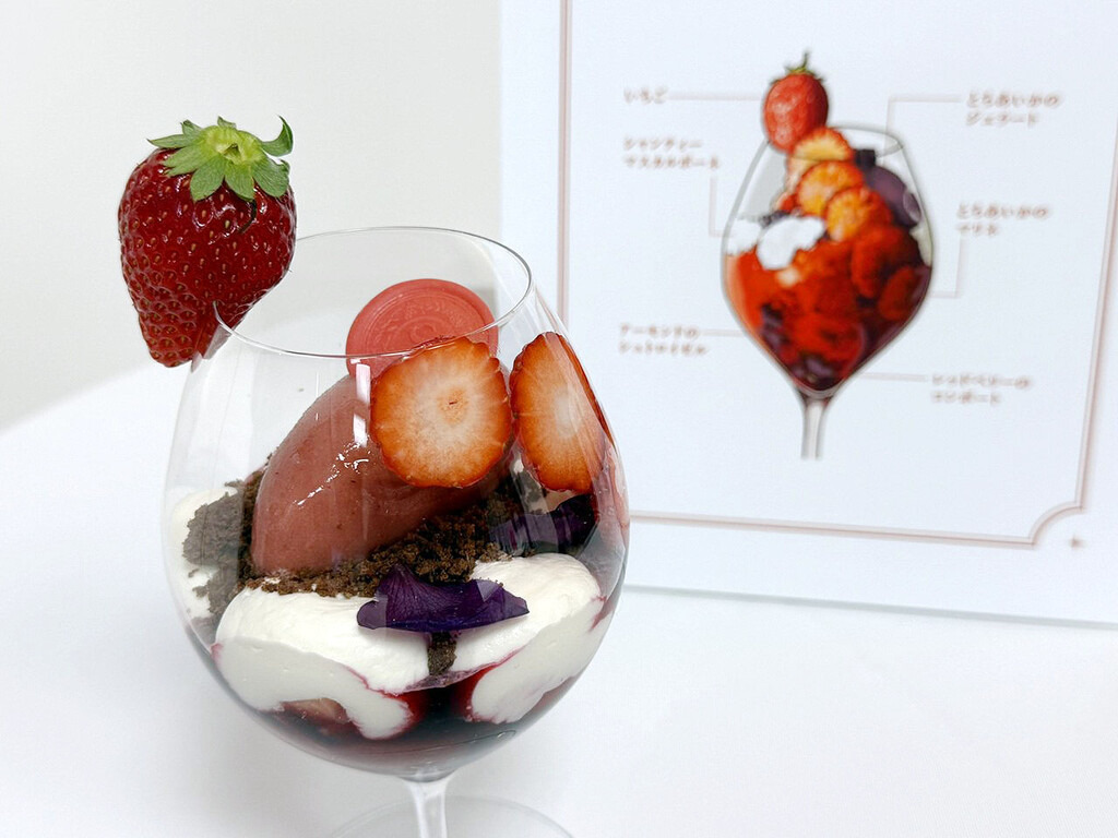栃木県の「とちあいか」を堪能できるパフェ。レッドペリーのコンポートに、とちあいかのマリネとアーモンドのシュトロイゼル 粒状の生地) 、ク レーム ム ショコラにシャンティーマスカルポーネ、とちあいかのジェラートを盛り付けた。可愛い焼き菓子もセットで楽しめる。