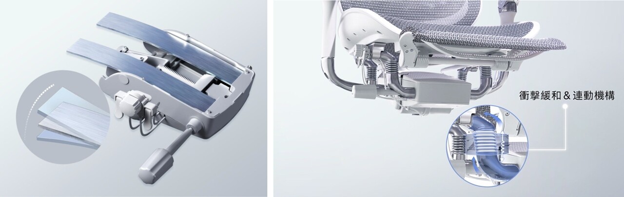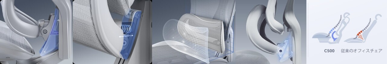 さらにリクライニングの際に椅子と体のフィット感を向上させる技術を採用。腰の場所をより正確にサポートし、座面と背もたれのリクライニングに合わせて柔軟に可動することで、どんなリクライニング角度になっても的確に体の疲れやすい場所をサポートすることができる。