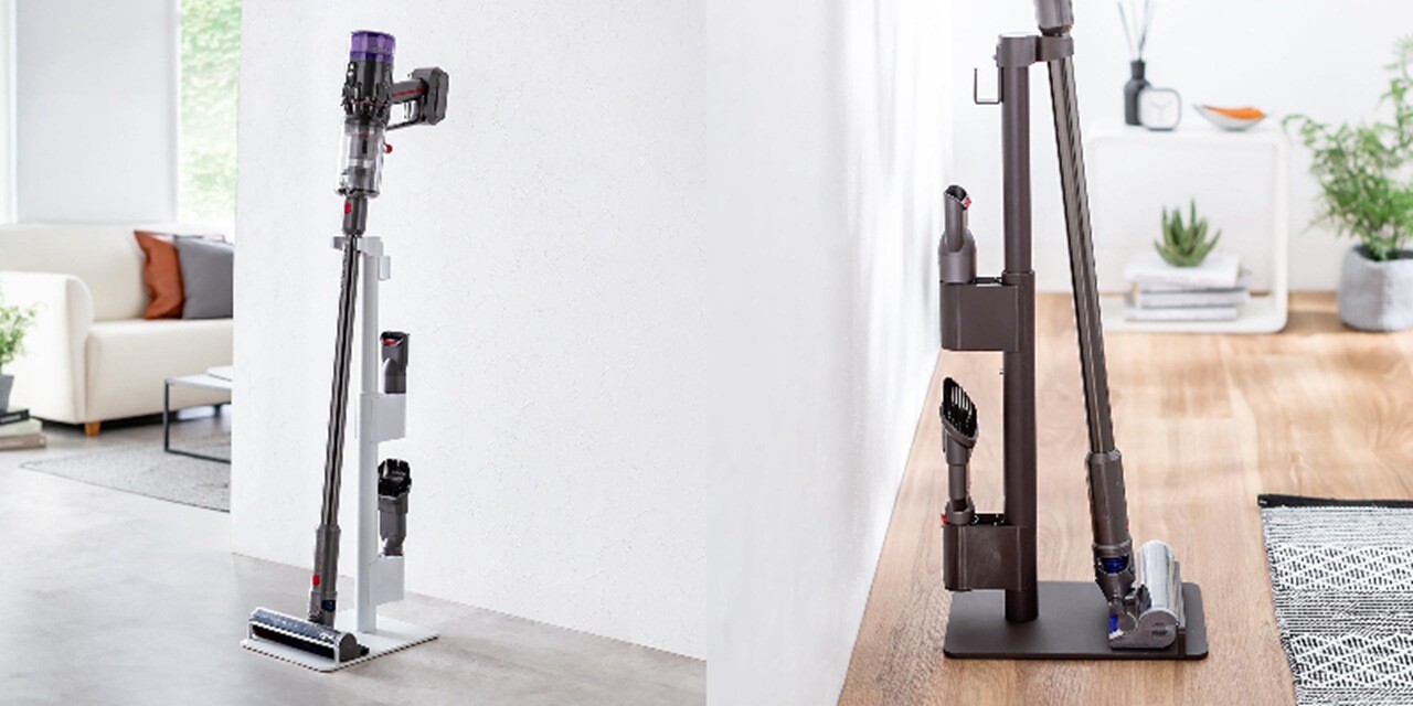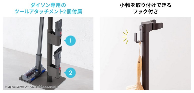 スタンドには、ダイソンの付属ツールを収納できるアタッチメントが2個付いている。掃除機のツールを一箇所にまとめて収納できるので、掃除後の片付けもスムーズ。フックもついており、小物を掛けることもできて便利だ。