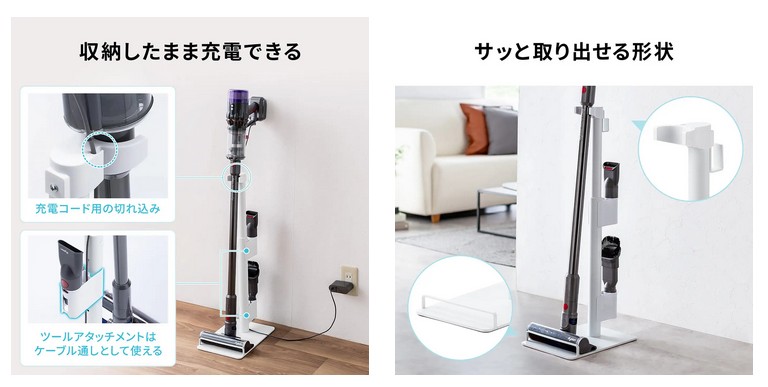 スタンドには、充電コード用の切り込みがついており、配線が乱れることなくきれいにまとめられる。掃除機を収納したまま充電できるので、いつでもフル充電で使え、見た目もすっきり整頓できる。