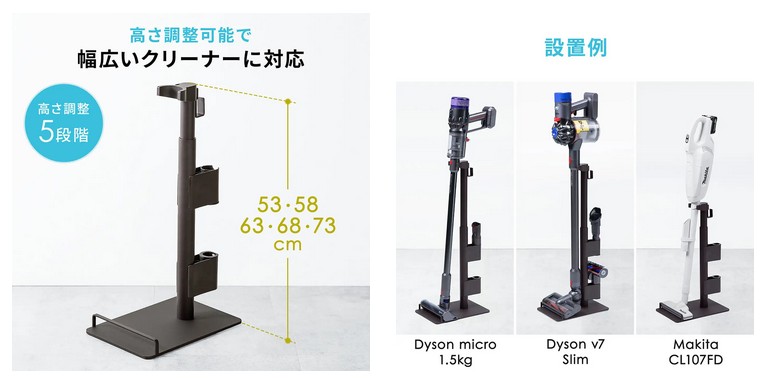 スティック部分の直径5cm以内、ヘッドの幅21cm以上、奥行き12cm以内の掃除機にぴったりフィット。高さは5段階で調整可能なので、様々な機種のコードレス掃除機を収納することができる。