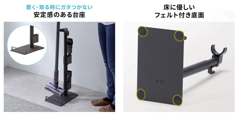 掃除機スタンドは、しっかりとした台座で安定感抜群。立てかけた掃除機がガタつくことなく、安全に収納できる。どんな場所でもしっかり支えてくれるため、安心して使用できる。裏面にはフェルがついているため、床を傷つける心配ない。