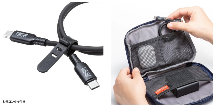 ケーブルタイが付属しているので、コンパクトにまとめることができる。別売りのガジェットポーチ(IN-HDAD1BKなど)に入れて、充電器や周辺機器と一緒に持ち運べる。