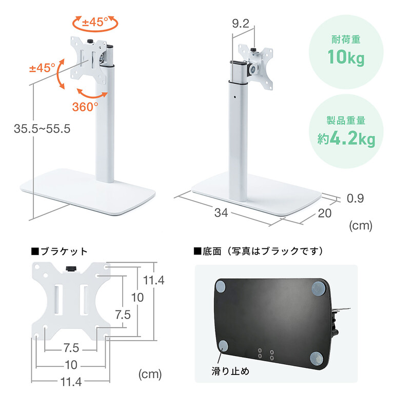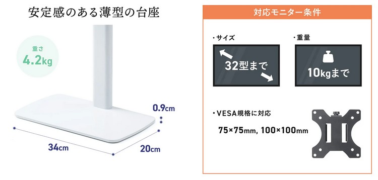 薄型の台座で、デスク周りをすっきりと整理できる。それでいて耐荷重は10kgまで対応しており、32インチ程度のモニターやテレビも安全に設置ができる。安定感のある設計で、長時間の使用でも安心だ。