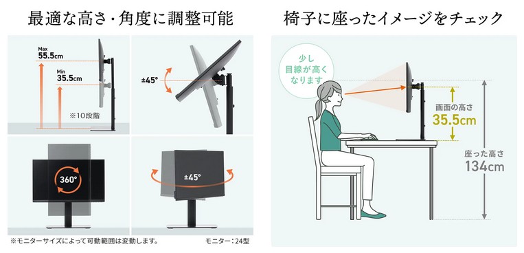 最大32インチのモニターに対応するこのスタンドは、35.5~55.5cmまでの高さ調整が可能だ。10段階の調整で、座ったままで最適なモニター位置を簡単にセットできる。作業中の首や目の負担を軽減し、快適な作業環境を提供する。