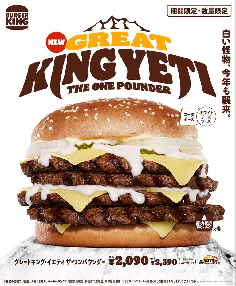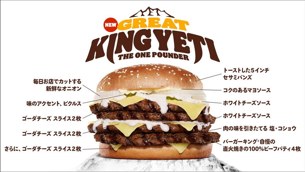 株式会社ビーケージャパンホールディングスは、2025年2月14日(金)より、直火焼きの100%ビーフパティ4枚とゴーダチーズスライス6枚をたっぷりのミルキーなホワイトチーズソースで仕上げた、モンスター級の超大型チーズバーガー『グレートキング・イエティ ザ・ワンパウンダー』(総カロリー1,692kcal*1、総重量550g*2)を期間・数量限定で新発売する。