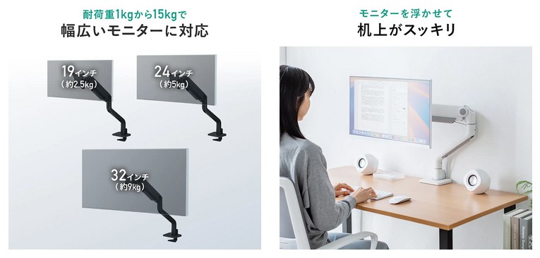 対応モニターサイズは17~35インチで、最大15kgまで幅広いモニターに対応している。モニターのサイズに関わらず、しっかりとしたサポートが可能で、大きなモニターを使用している方にも安心して利用できる。