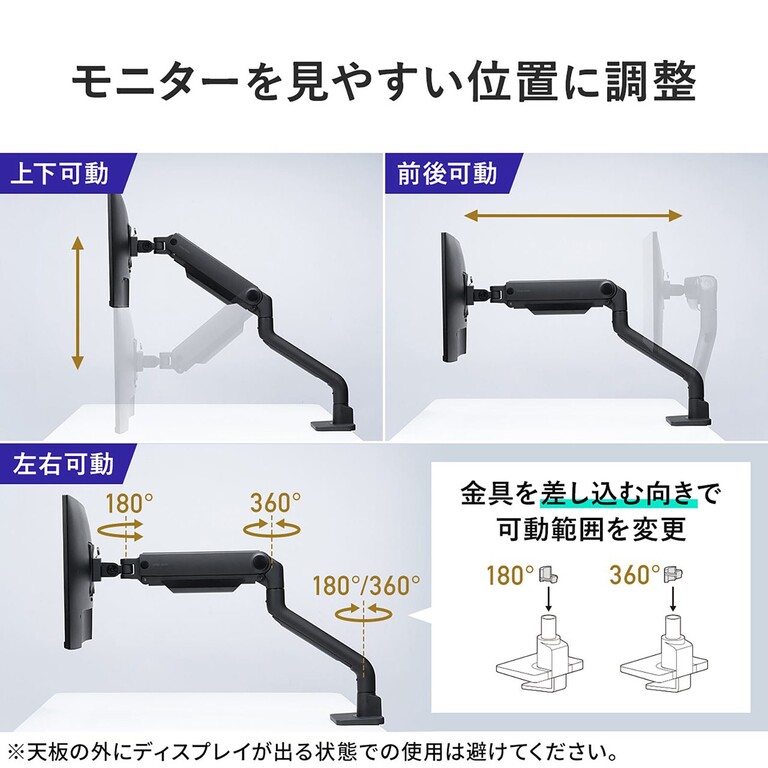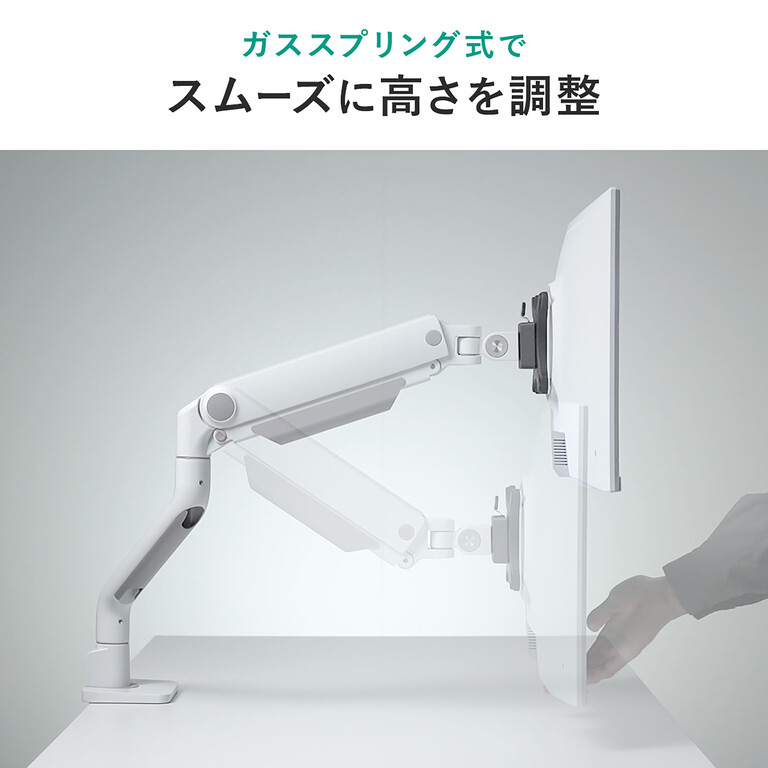このモニターアームは、ガススプリング内蔵の4軸タイプで、モニターの高さをスムーズに調整できる。目線に合わせて簡単に上下調整が可能なため、作業の疲れを軽減し、より快適な作業環境を提供する。デスクワークをもっと快適にしたい方におすすめだ。