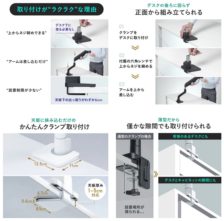 上からネジを締めるだけで簡単に設置でき、デスク背面に回ることなく正面から組立てが可能だ。クランプは天板下の出っ張りがわずか6mmとコンパクトで、設置制限が少ないため、狭いスペースでも問題なく使用できる。
