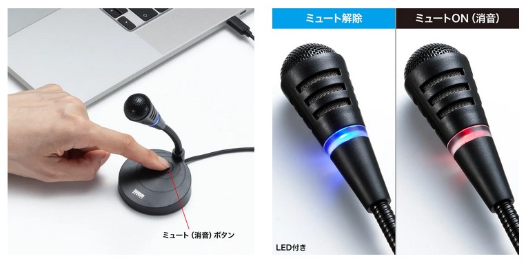 簡単にマイクのON・OFFができるミュート(消音)ボタン付き。LEDインジケーターと連動しており、一目で状態を確認できる。
