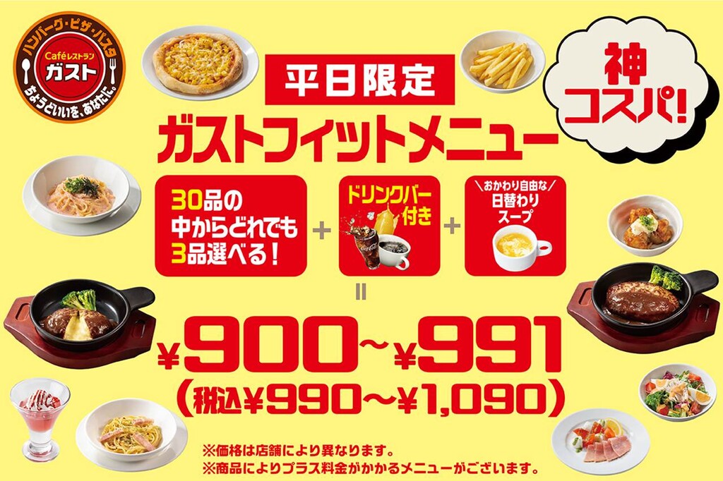 “神コスパ”メニュー「ガストフィットメニュー」は平日限定で、豊富な30品の中から自由なチョイスで楽しめる。興味を持った人は、ぜひ、この機会に体験しよう。