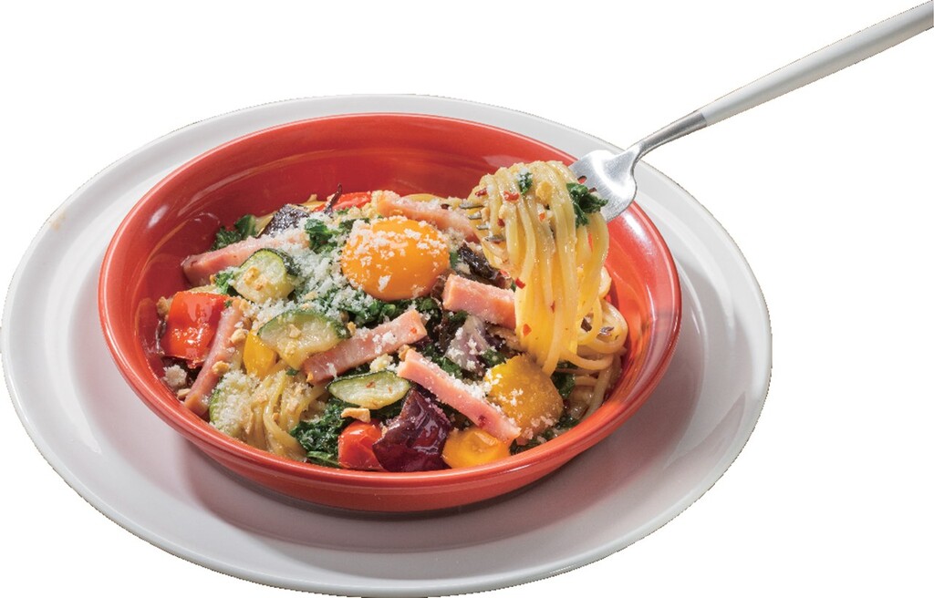 加熱したケールを加えたオリジナルパスタ。ペペロンチーノソースに卵がよく絡み、まろやかな味わいに。