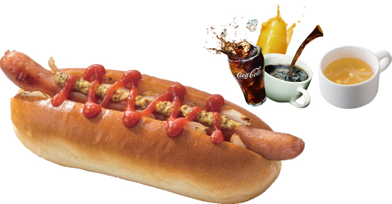 約20cmのポークソーセージとさっぱり味付けした玉ねぎを一緒にサンド!ケチャップと粗挽きマスタードで豪快に楽しめる日替わりスープとドリンクバー付き。