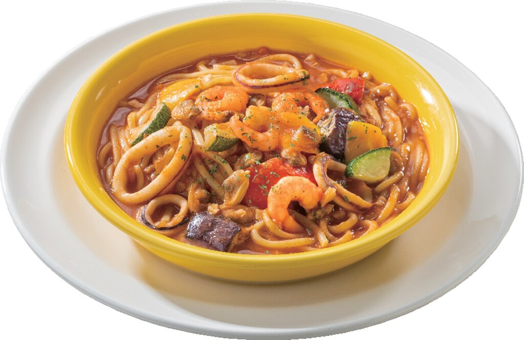 トマトをたっぷり使用し、チキンブイヨンとフィッシュブイヨンを加えて作ったトマトスープにイカ、エビ、あさりのシーフードがたっぷり入っている。
