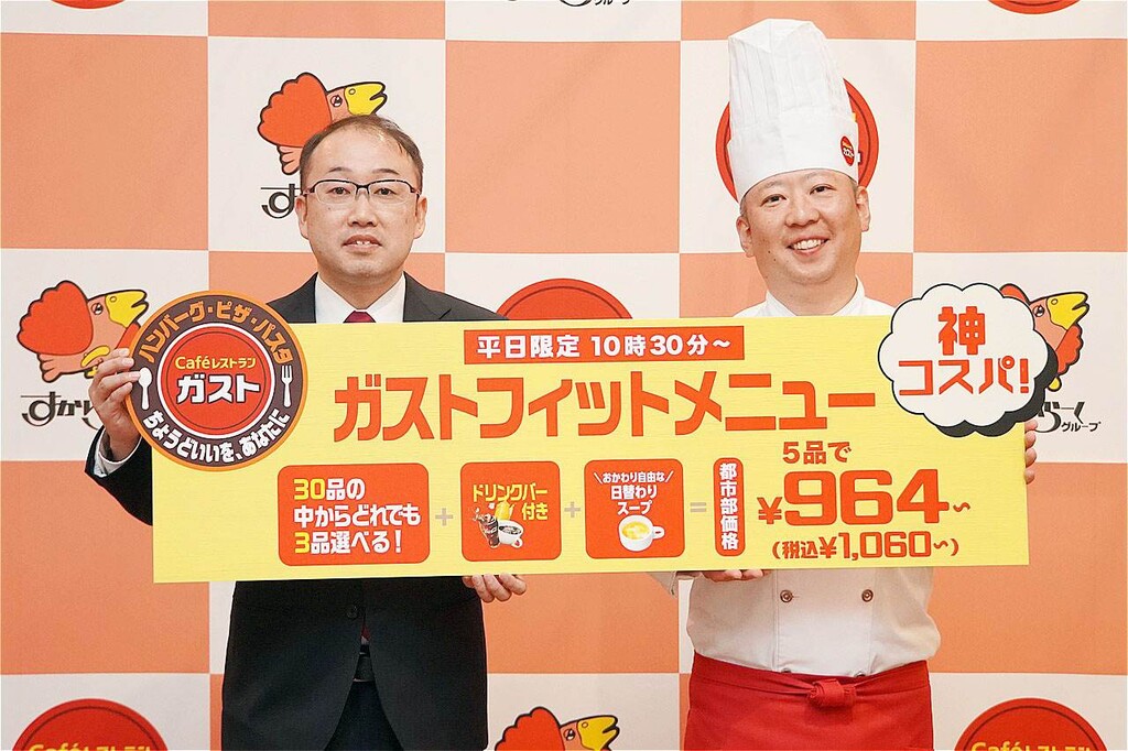 株式会社すかいらーくレストランツが運営するガストでは、老若男女問わず幅広いお客様に“ちょうどよく”ご利用いただけるレストランを目指して、新ブランドタグライン「ちょうどいいを、あなたに」を制定する。ブランドタグライン発表に伴い、豊富な30品の中から自由なチョイスで楽しめる“神コスパ”メニュー「ガストフィットメニュー」の販売を2025年2月20日(木)から、平日限定10時30分~開始する。販売に先駆け、報道関係者向けにガストの新提案「ガストフィットメニュー発表会」を2025年2月19日(水)にガスト 大久保店にて開催した。