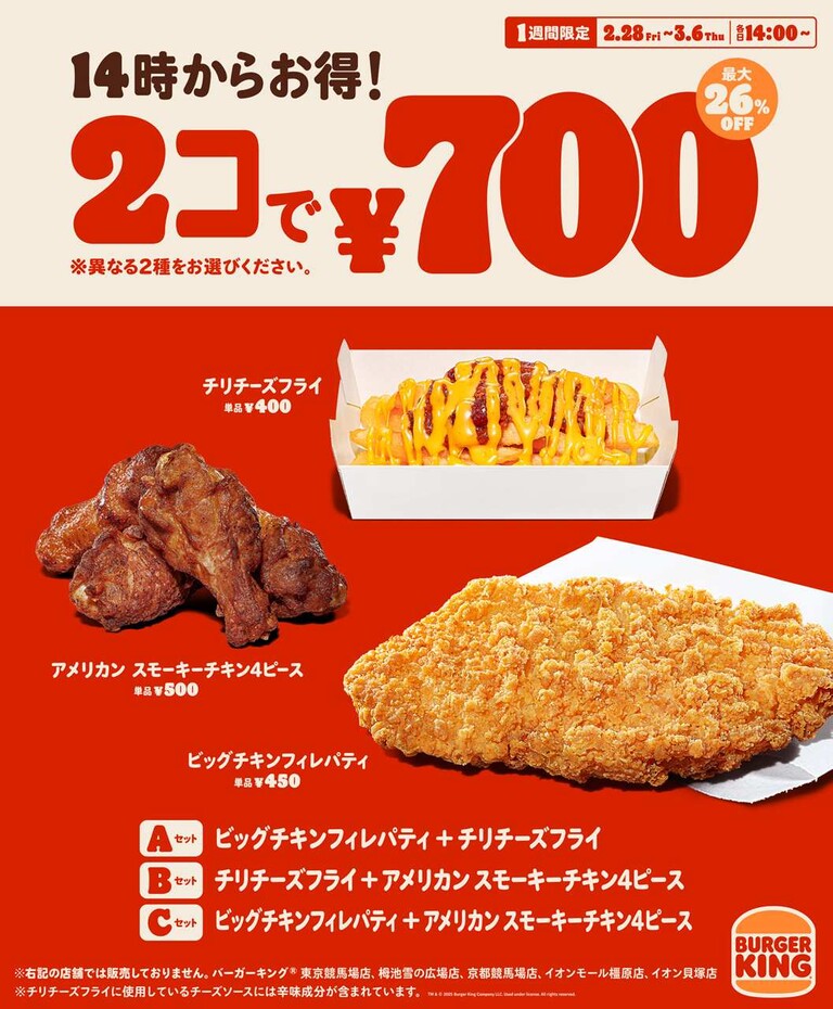 株式会社ビーケージャパンホールディングスは、2025年2月28日(金)~3月6日(木)の1週間限定で、各日14時から、バーガーキングでしか味わえないやみつきのサイドメニュー『アメリカン スモーキーチキン 4P』『ビッグチキンフィレパティ』『チリチーズフライ』の対象3種類から異なる2種類を組み合わせて、最大積上げ価格950円のところ、26%オフ250円引きの700円で提供するお得なキャンペーンを開催する。