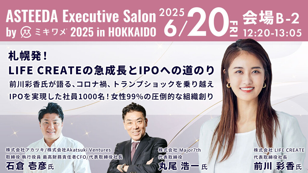 「琉球ASTEEDA Executive Salon by ミキワメ 2025 in HOKKAIDO」は、2025年6月19日(木)~20日(金)に開催される、日本最大級のビジネスリーダーのための“明⽇への希望”となる交流と学びの祭典だ。セッション「札幌発!LIFE CREATEの急成長とIPOへの道のり〜前川彩香氏が語る、コロナ禍、トランプを乗り越えIPOを実現した社員1000名!!女性99%の圧倒的な組織創り〜」は、6月20日(金)12時20分から会場B-2で開催される。