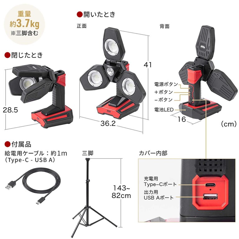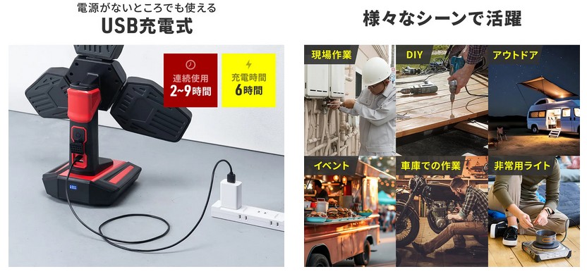 本製品はリチウムイオンバッテリーを内蔵し、最大9時間の連続使用が可能だ。キャンプや工事現場、災害時の停電など、電源のない環境でも大活躍。USB充電式で、移動中の充電も手軽に行える。