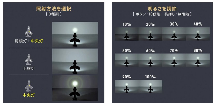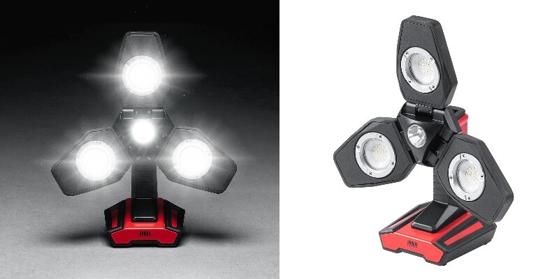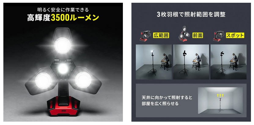 羽根灯と中央灯の合計で最大3500ルーメンを実現し、夜間の作業や暗所での作業を力強くサポート。LEDならではの瞬時点灯と高演色性により、手元がくっきり見える快適な照明環境がつくれる。